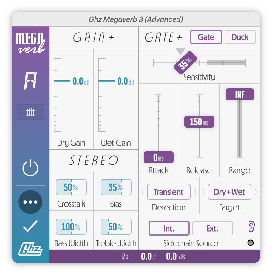 Gated reverb is a quintessentially 80’s sound, and Megaverb makes achieving that sound easy: just turn on the gate and trigger it with something transient (you can also trigger Megaverb’s gate with the built-in sidechain if desired). But Megaverb doesn’t stop there! — we’ve also added a ton of other gating and ducking options that make it possible to achieve highly dynamic, adaptive reverb sounds and other interesting gating effects. See the Advanced Gate + controls for more information on how the advanced controls work and what you can do with them.