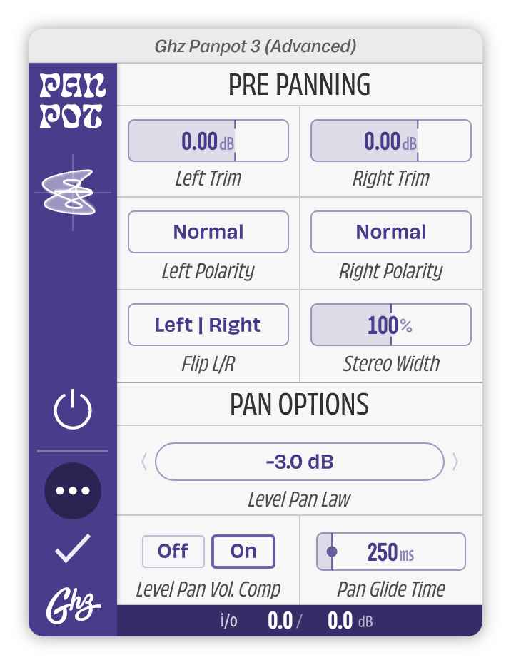 The most unusual panning type: Panpot’s Phase module creates a constant phase shift between the left and right channels. Similar to Delay panning, Phase panning does not alter the stereo level balance but instead alters the arrival times of the left/right channels.