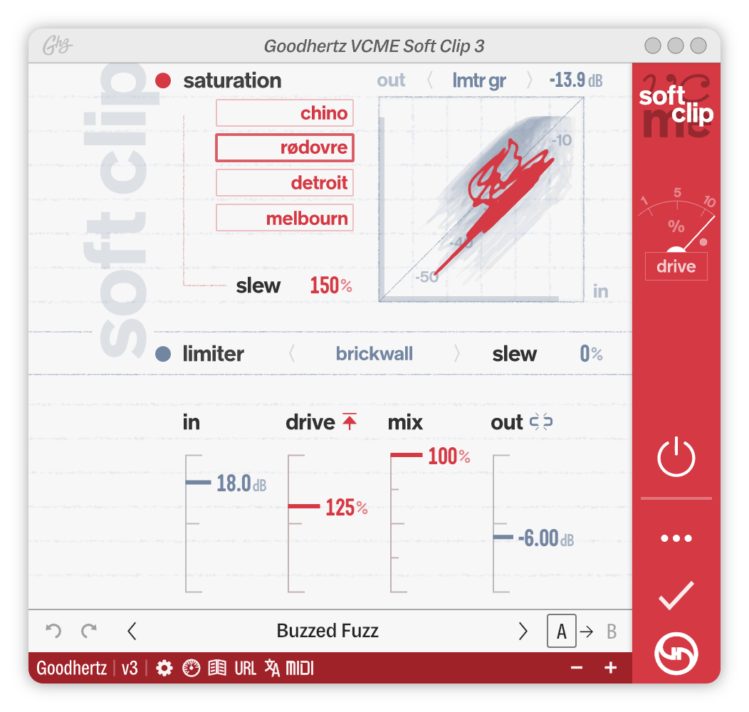 200% is extreme saturation and distortion, almost fuzz-like. This setting adds extreme amounts of gain (more than 40 dB) with extended harmonics. The limiter knee is the softest at this setting, producing tape-like soft clipping. We recommend using HQ Mode when pushing Soft Clip Drive hard.