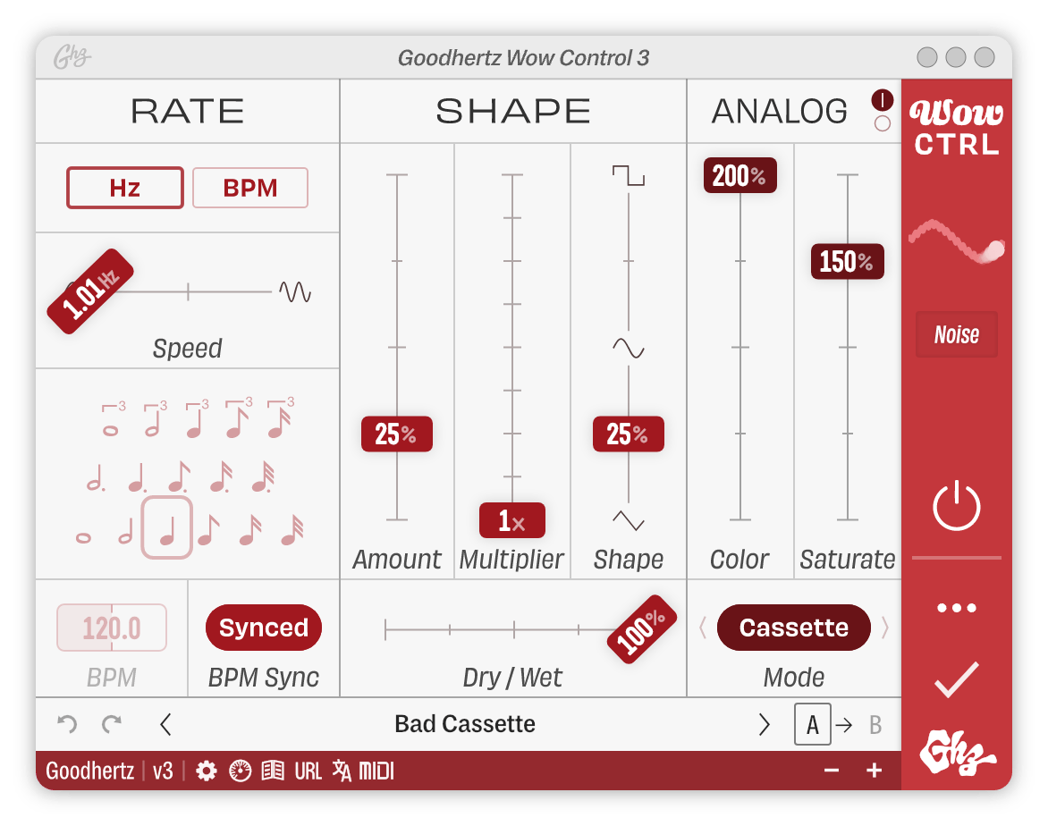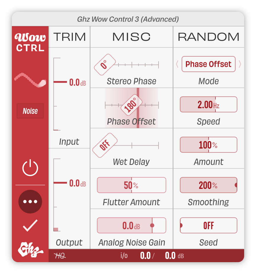 At their default settings, each Analog Mode produces some noise. To adjust the noise level, use the advanced Analog Noise Gain control.